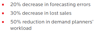 The impact of AI has proved to be a game changer for Danone Group. This French food manufacturer uses artificial intelligence and machine learning to improve demand forecasts. This has led to a 20% decrease in forecasting errors and a 50% reduction in agent workload (possibly resulting in future decreased labor costs). The company also notes that this has resulted in a 30% decrease in lost sales.