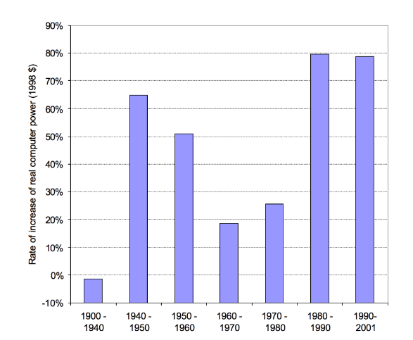 Simultaneously, and not circumstantially, the real value of computing power has increased at an extremely rapid rate over the past 50+ years. Raw computing power per dollar has averaged an increase of about 60% over the past quarter century.